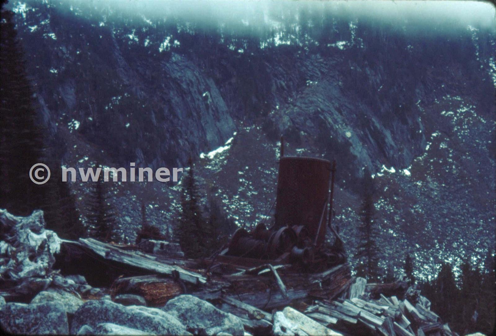 Steam donkey in basin below adits 6 & 7 - photo October 1974.
