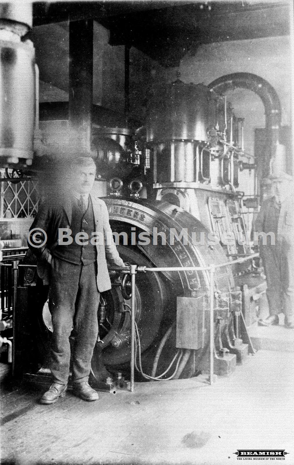 Ralph Telfer and John Elliot standing beside Belliss & Morcom triple expansion engined steam generator, Settlingstones Witherite Mine. Date:c1930, from the Beamish Museum Photoarchive.