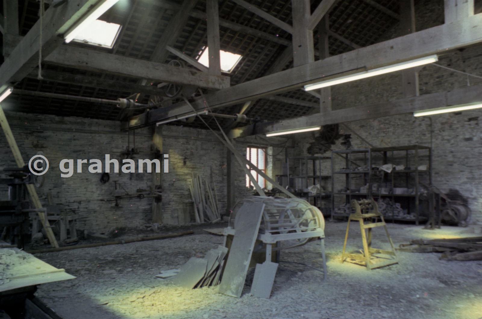 There was a conventional dresser, driven from the overhead shafting. You can see the belting arrangement clearly, with the transfer from the main shaft to the dresser shaft.