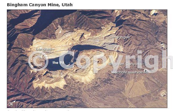 This astronaut photograph of the Bingham Canyon Mine shows parallel benches (stepped terraces) along the western pit face. These benches range from 16 to 25 meters high, and they provide access for equipment to work the rock face and maintaining the stability of the sloping pit walls. A dark, larger roadway is also visible directly below the benches. Brown to gray, flat-topped hills of gangue (waste rock) surround the pit, and are thrown into sharp relief by shadows and the oblique (from the side) viewing angle of the photograph. Reservoirs for leach water (associated with ore processing) are visible to the south of the city of Bingham Canyon.