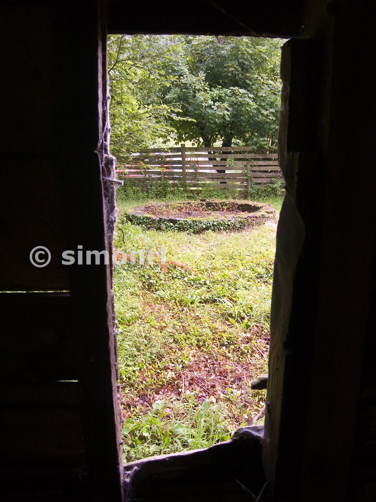 Looking out of the original Black Tom Winding Engine House towards the (capped) Black Tom Shaft. Snailbeach Mine 06/06/2009