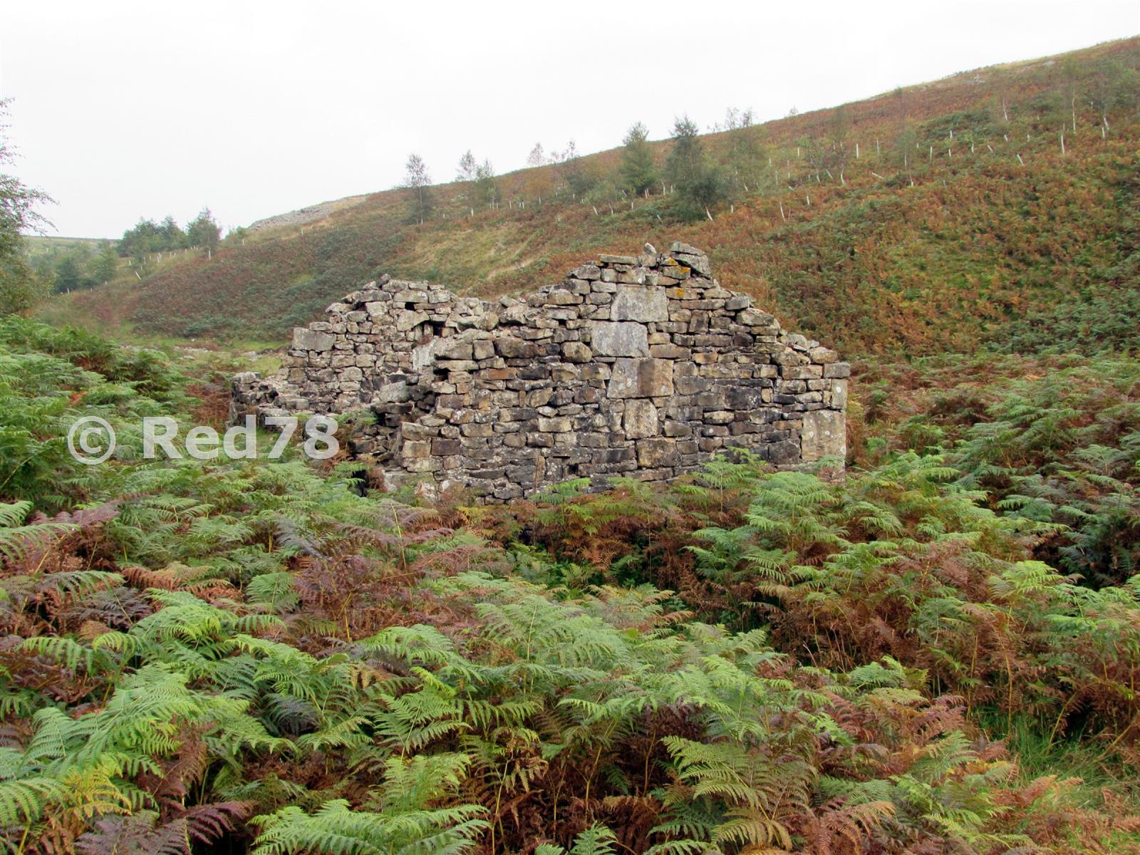 The multitude of bracken hides the spoil heap, which mostly consists of deads of limestone & a black shale. There is very little mineral worth to be found in the tip. The ruin of the blacksmith shop is a good guide to explorers looking for the level mouth, which from here is past the building, and slightly around the corner. There is a strong flow of water exuding from it.