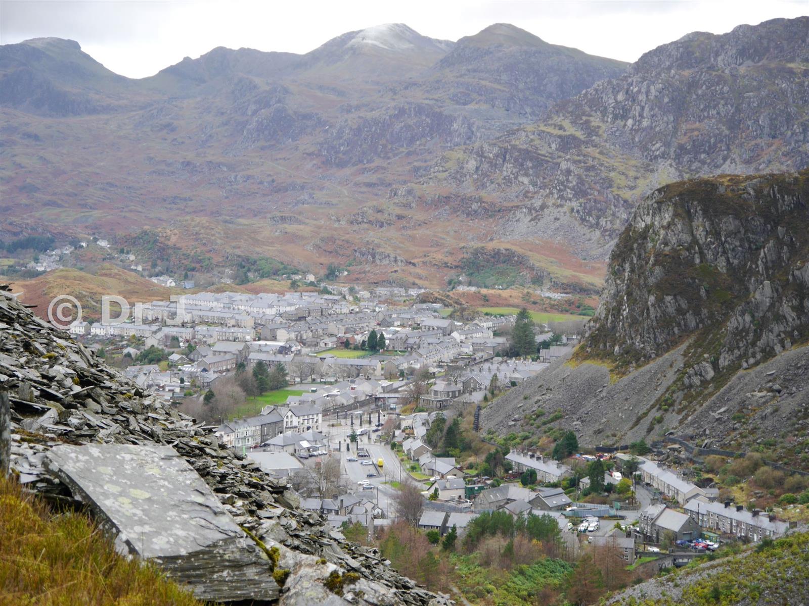 View of Blaenau from the lower Diffwys tips, looking across to a snow capped Moelwyn Mawr