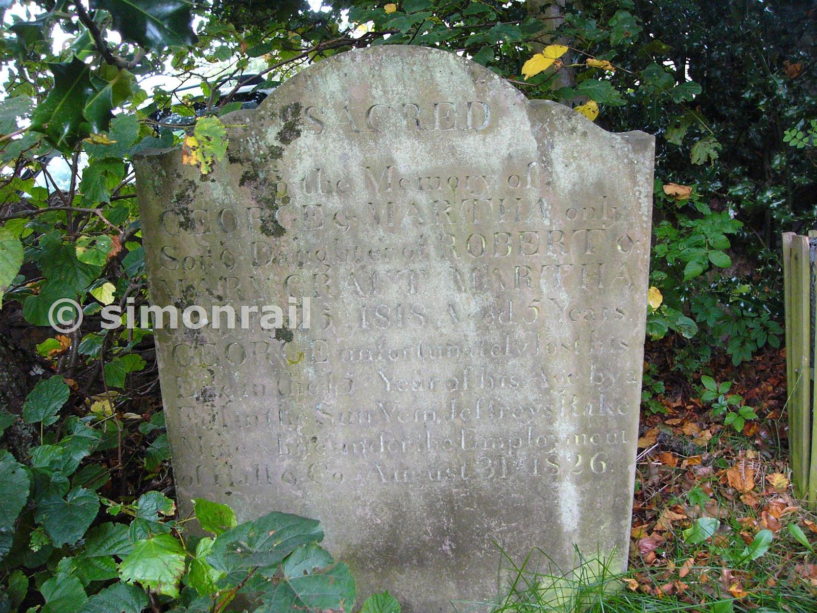 Sacred to the memory of George & Martha only son & daughter of Robert & Mary Craft. Martha died May 25 1818 aged 5 years. George unfortunately lost his life in the 15th year of his age by a fall in the Sun Vein Jeffreys Rake Mine when under the employment of Hall & Co. August 31st 1826.
