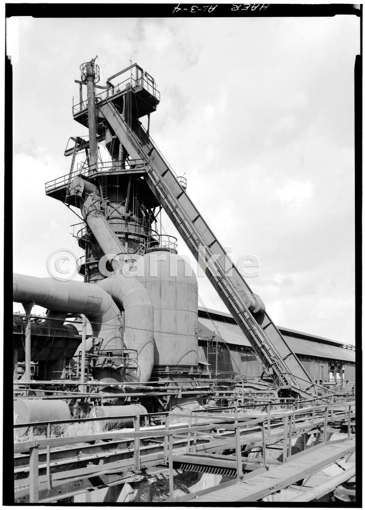 March 1974. VIEW FROM THE SOUTH OF THE #1 BLAST FURNACE WITH SKIP HOIST AND DUST CATCHER. STOCK BINS FOR RAW MATERIALS ARE IN THE FOREGROUND, THE #2 CASTING SHED BEYOND. Courtesy Library of Congress, Prints & Photographs Division, HAER, Reproduction number HAER ALA,37-BIRM,4-4