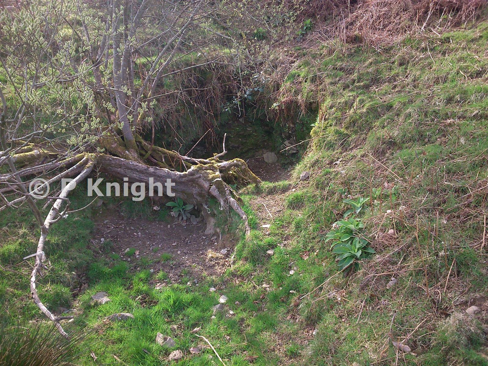 The blocked adit above the main shaft. There is a small spoil heap in front so this may be a trial level.