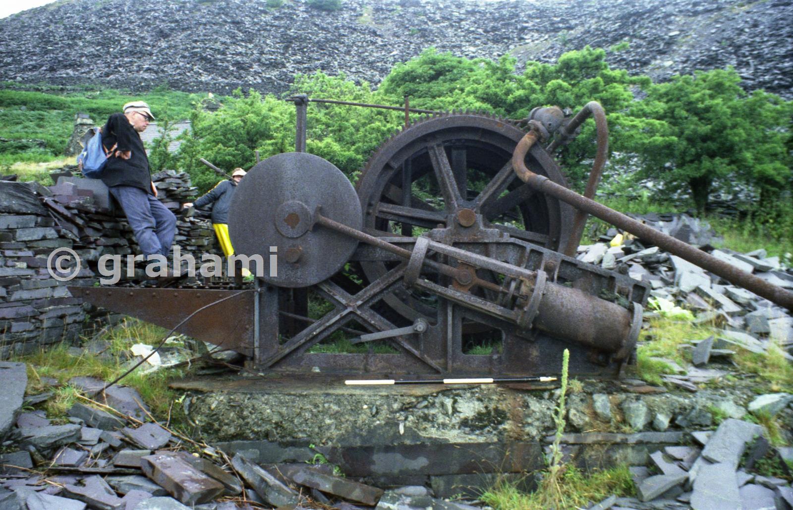 Here, it's temporary shelter long gone, is the cableway engine. A Henderson steam driven variety, still with its cylinders and most of its valvegear etc. in place - brasswork long gone of course.