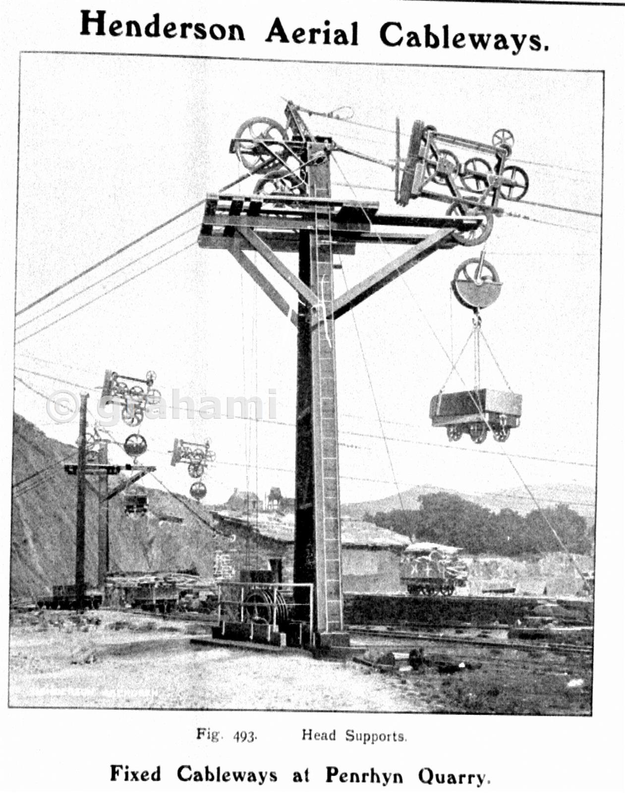 Another catalogue illustration. this shows the main masts with the pulleys at the foot redirecting the traversing rope and hoisting rope through a right angle towards the motor house behind the photographer.