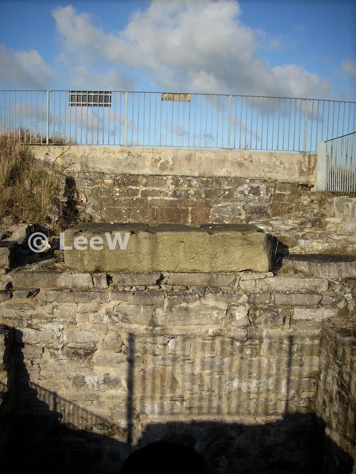 Part of the Bob Wall section of the pumping engine house at shaft collar level with the shaft inthe background. The arch through to the condenser pit is at the bottom of the photo (Dec 2009)