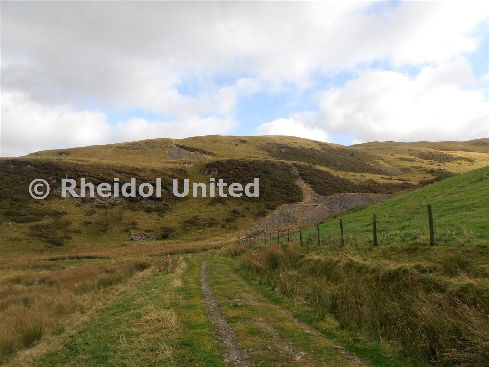 Approaching the mine. The large tip in the middle marks the entrance to the middle adit, a large open-stope near the top of the hill and the upper adit on the top right.