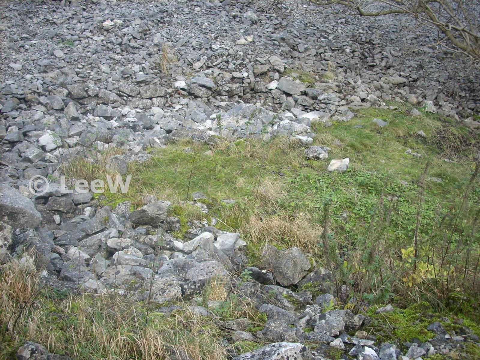 A fews courses of stonework are just visible (SE feature) and a rectangular infilled feature (nearest) which are covered by scree. Compare these photos to the historic 'dig' photos
