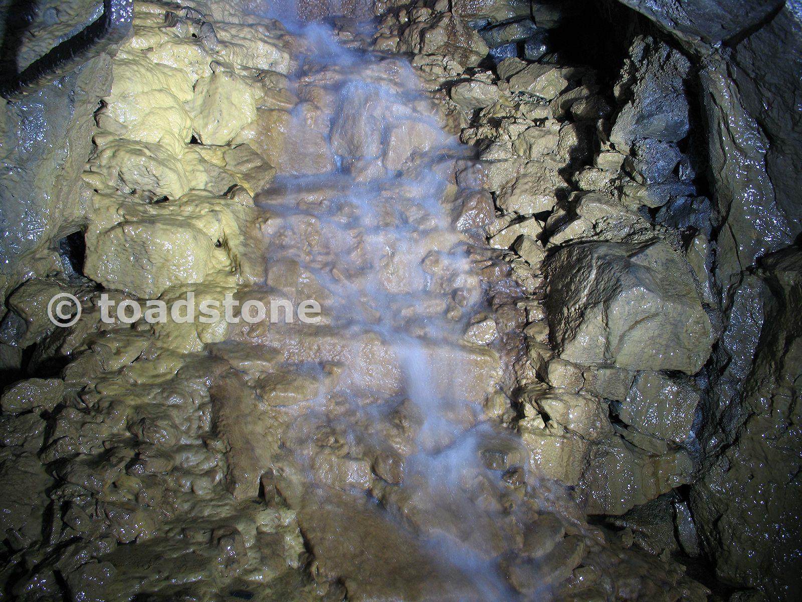 This shows the calcification of the rubble which has fallen down. Climbing up this section allows access to Chadwick Mine. Slow exposure gives the water an unfocused effect.