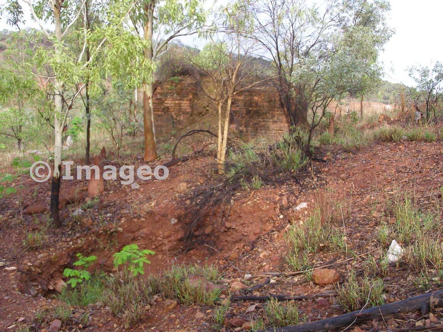 Subsiding shaft in rehabilitated mining area with brick footings immediately behind. Is this a winder foundation or a stack base ?
