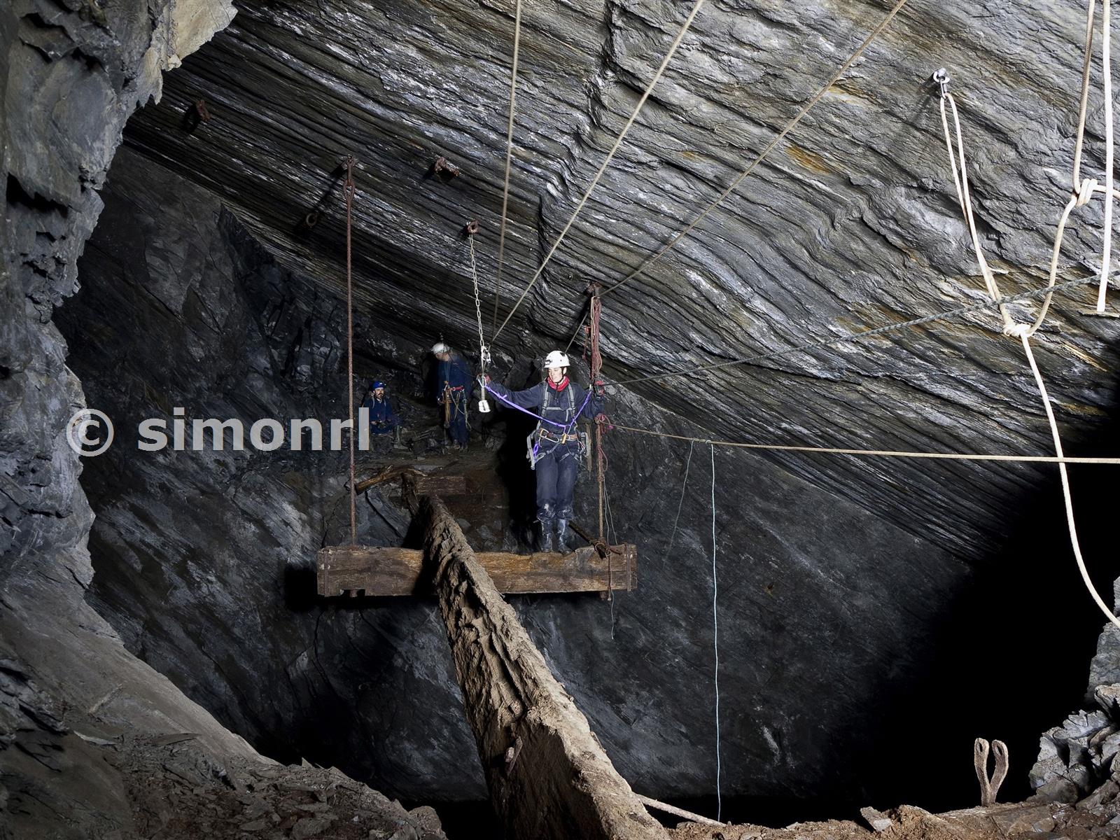 One half of the Adventuring Duo crossing the bridge in Chamber A16E. Croesor Slate Mine September 2011