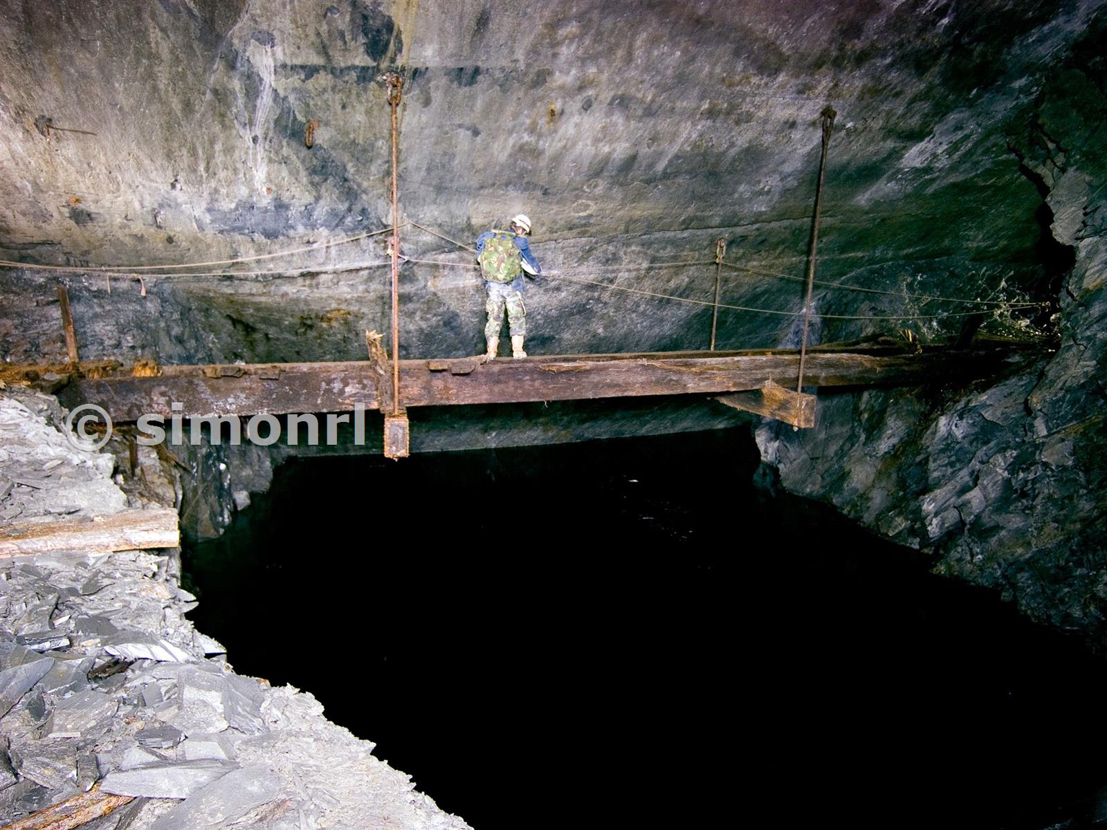 Crossing the brige in Croesor chamber A10E. This bridge has deteriorated significantly over the past few years, the first time I saw it most of the planks were in place on the first half, now almost all have falled into the water. Croesor Slate Mine 30/05/2009