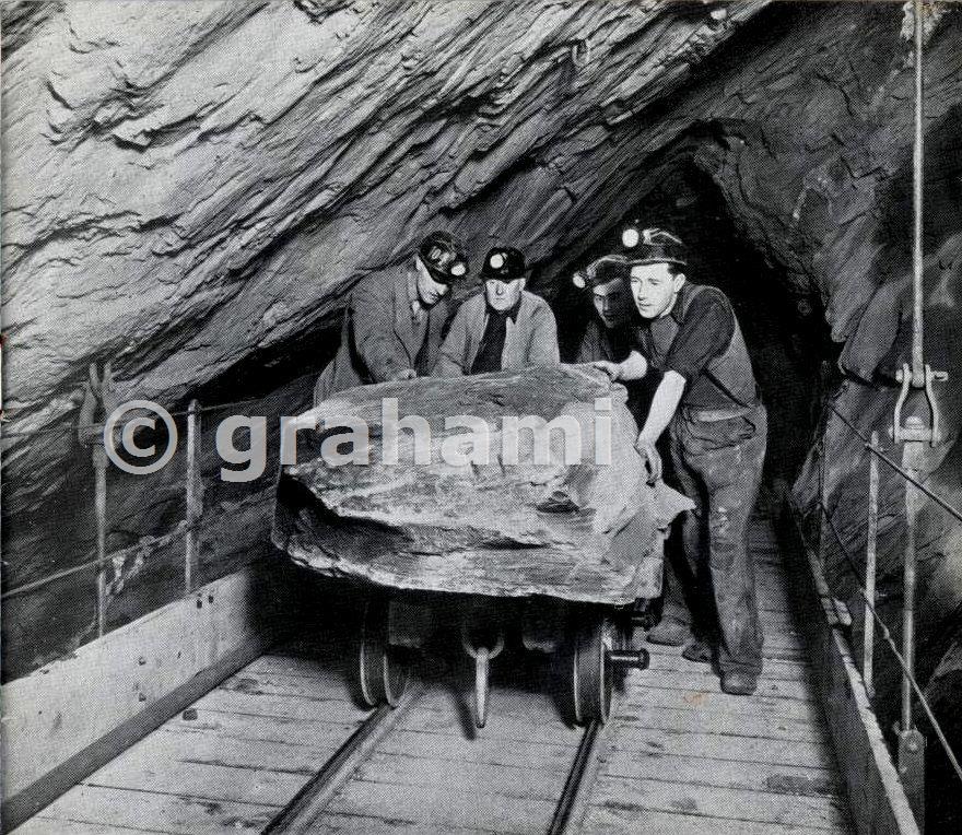 A slab is pushed over the new bridge on O Floor - Oakeley made very little use of locomotives underground, most haulages being manual, even up to the 1960s.