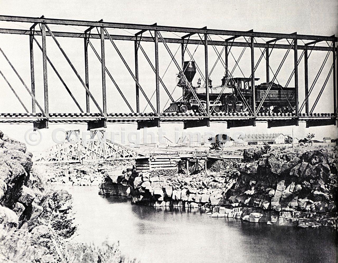 Utah & Northern Bridge at Eagle Rock (Idaho Falls), Idaho circa 1880 with railroad shops in background.