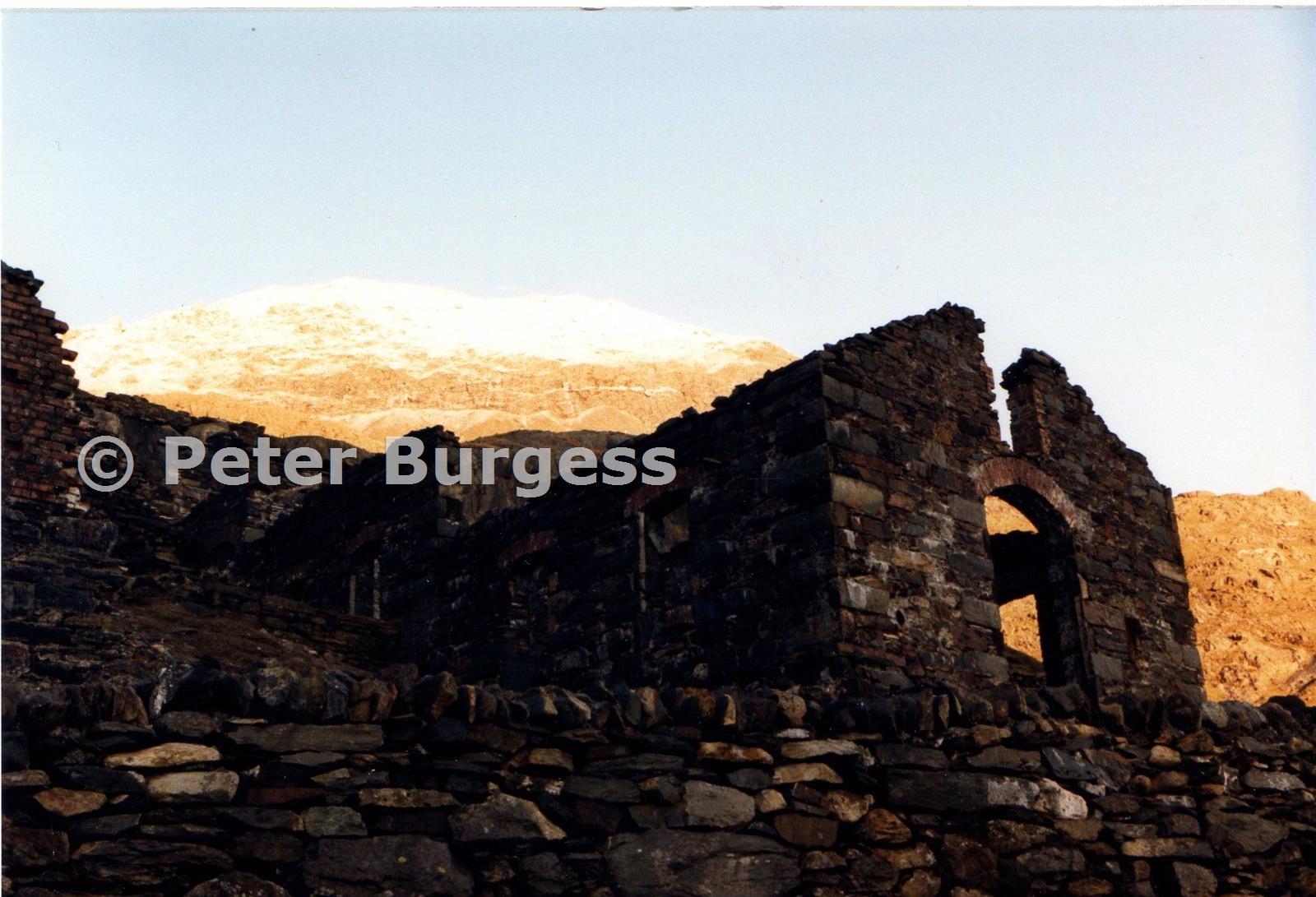 Wintry sunshine on the mountain, with the ruined mine building deep in shadow. This was probably a very grim place to work.