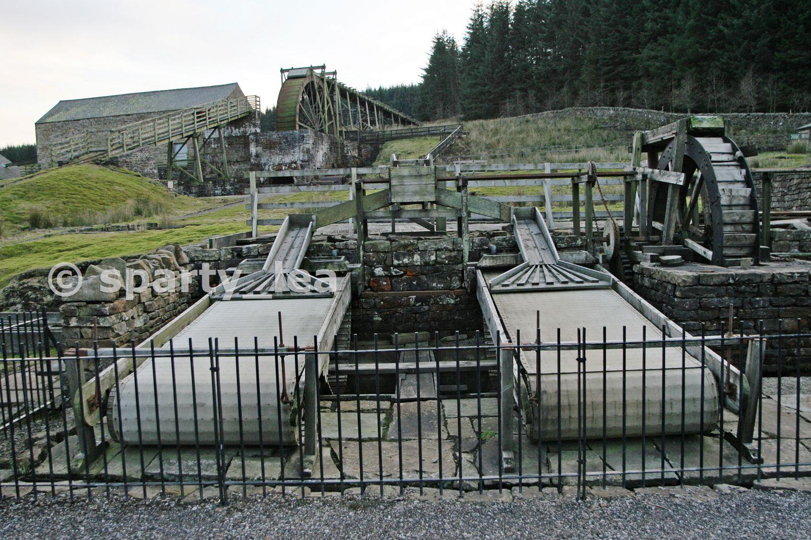 A pair of Brunton buddles for separating lead ore from its matrix. The body of the machine is a canvas belt which runs uphill while a mixture of finely crushed ore and rock is fed onto the belt in a stream of water from the top. The lighter rock is washed down the belt while the heavier particles of lead are carried up the belt and over the top to then be washed off the bottom of the belt into a collecting pit beneath.