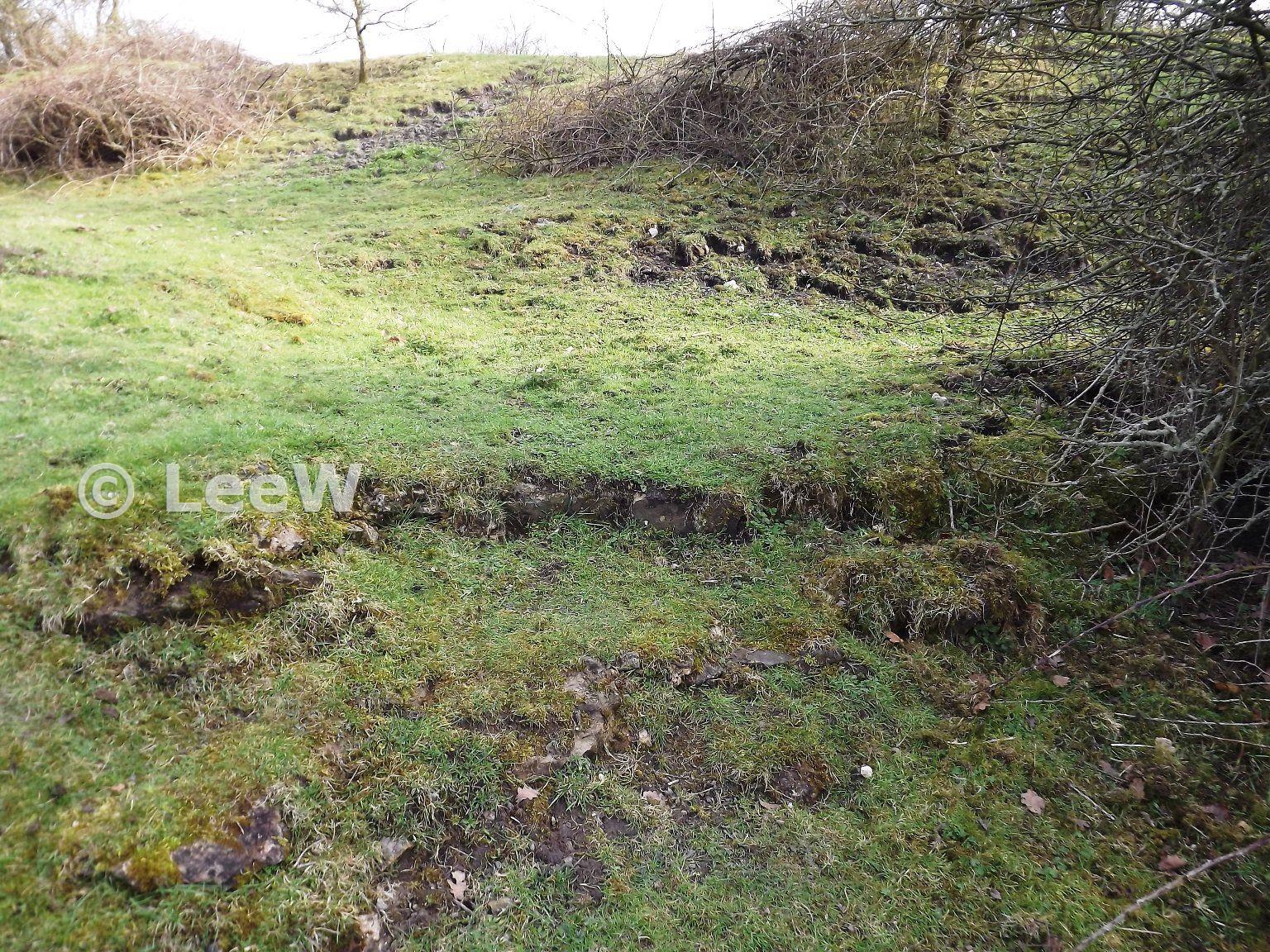 Possible wall or foundations relating to the engine house. The shafts are located slightly above this flattish area. There are also some stone blocks adjacent