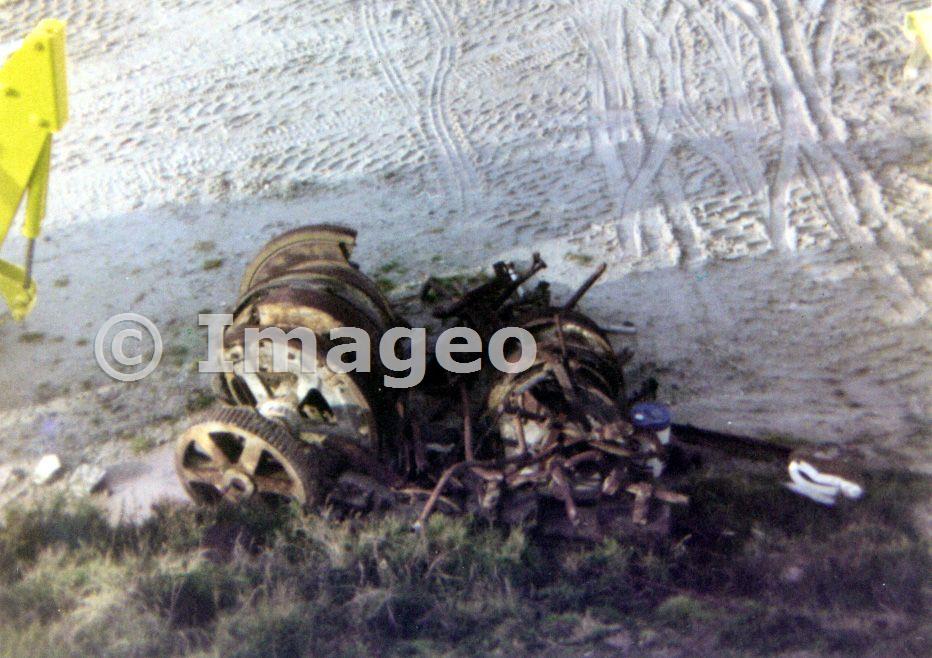 The remnants of a winder mechanism unceremoniously dumped on the other side of the Stenalees - Roche road, possibly from the Bunny Mine, early 1970s.
