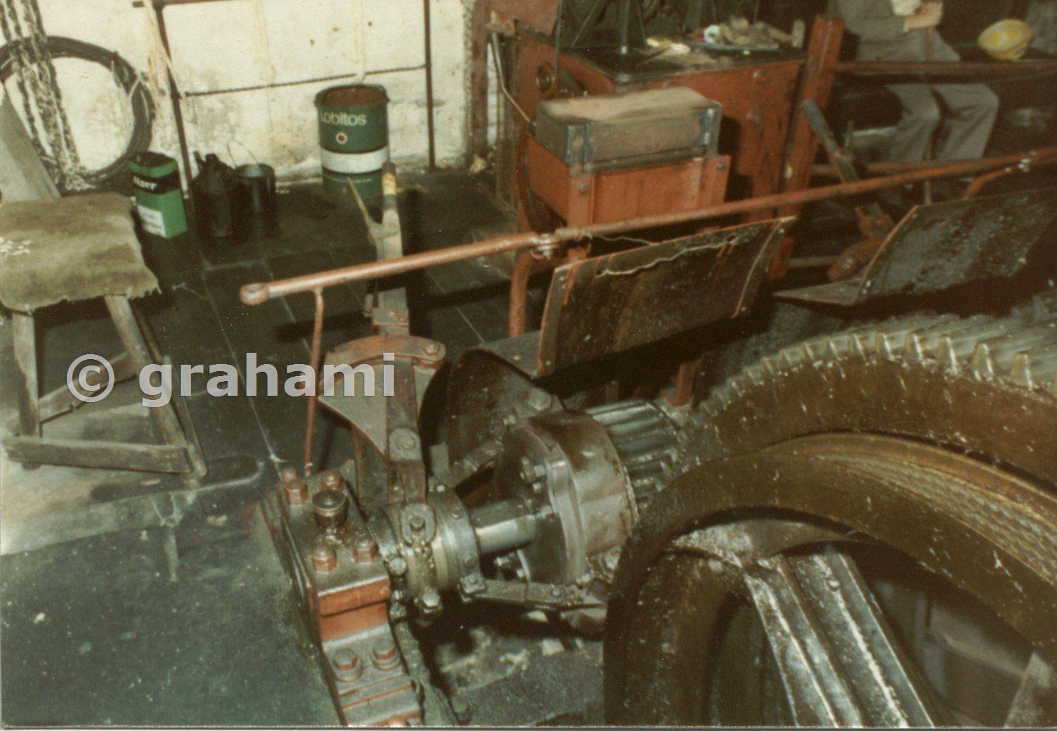 A closup view of the clutch mechanism for the hoisting drum.
