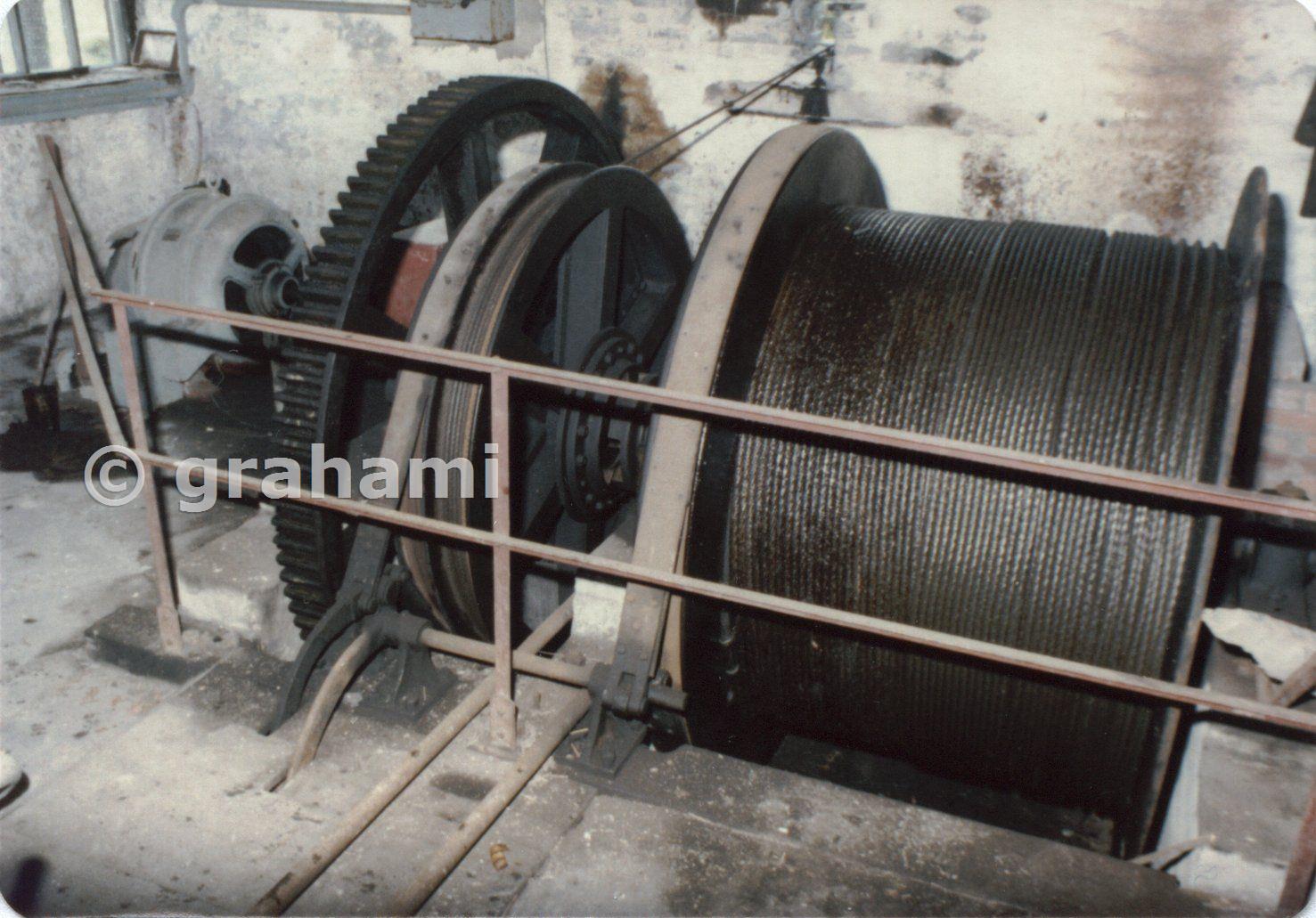 From left to right: 1908 vintage AC motor, traversing cable drum brake, traversing cable drum, clutch space, hoisting drum brake, hoisting drum.