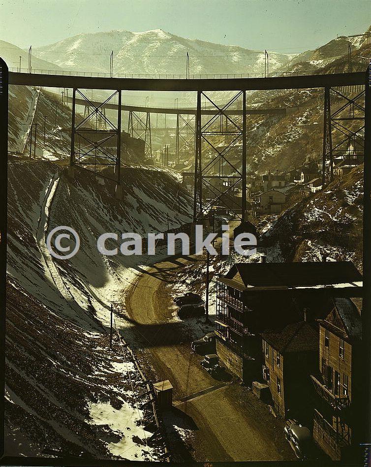 Carr Fork Canyon as seen from "G" bridge, Bingham Copper Mine, Utah. In the background can be seen a train with waste or over-burden material on its way to the dump LoC REPRODUCTION NUMBER: LC-DIG-fsac-1a34851