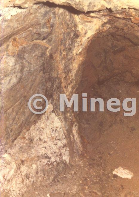 Photo of the Harding Vein being cut and displaced by the Grainsghyll Lead Vein. The tungsten vein is shifted about 2.5m to the east by the later lead vein.