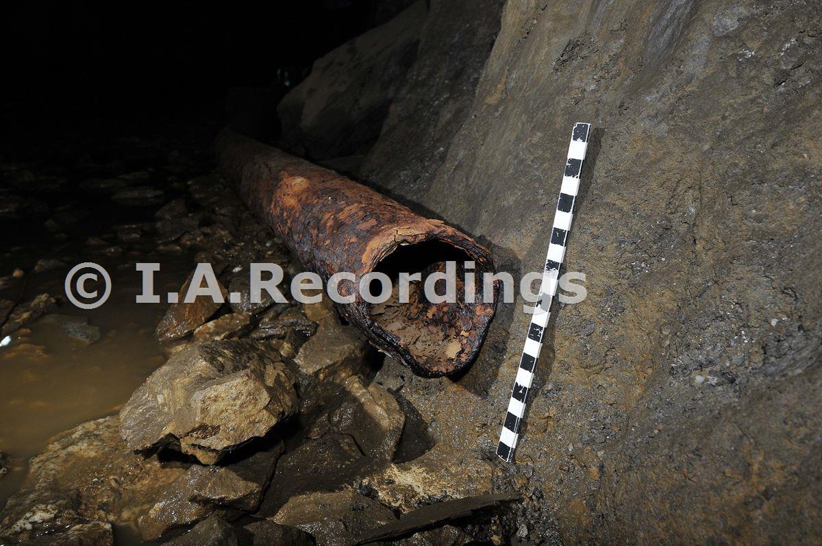 Cast iron pipe at the junction of the entrance adit with Stewart''s stope. [b/w scale stick: 5cm squares]