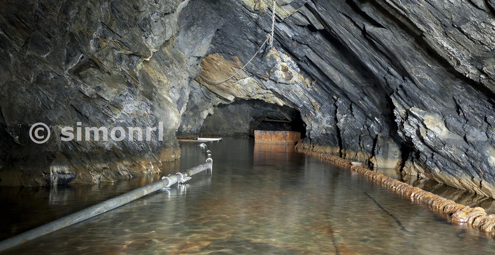The new scaffold pipe causeway, E floor, back vein. Cwmorthin Slate Mine June 2012