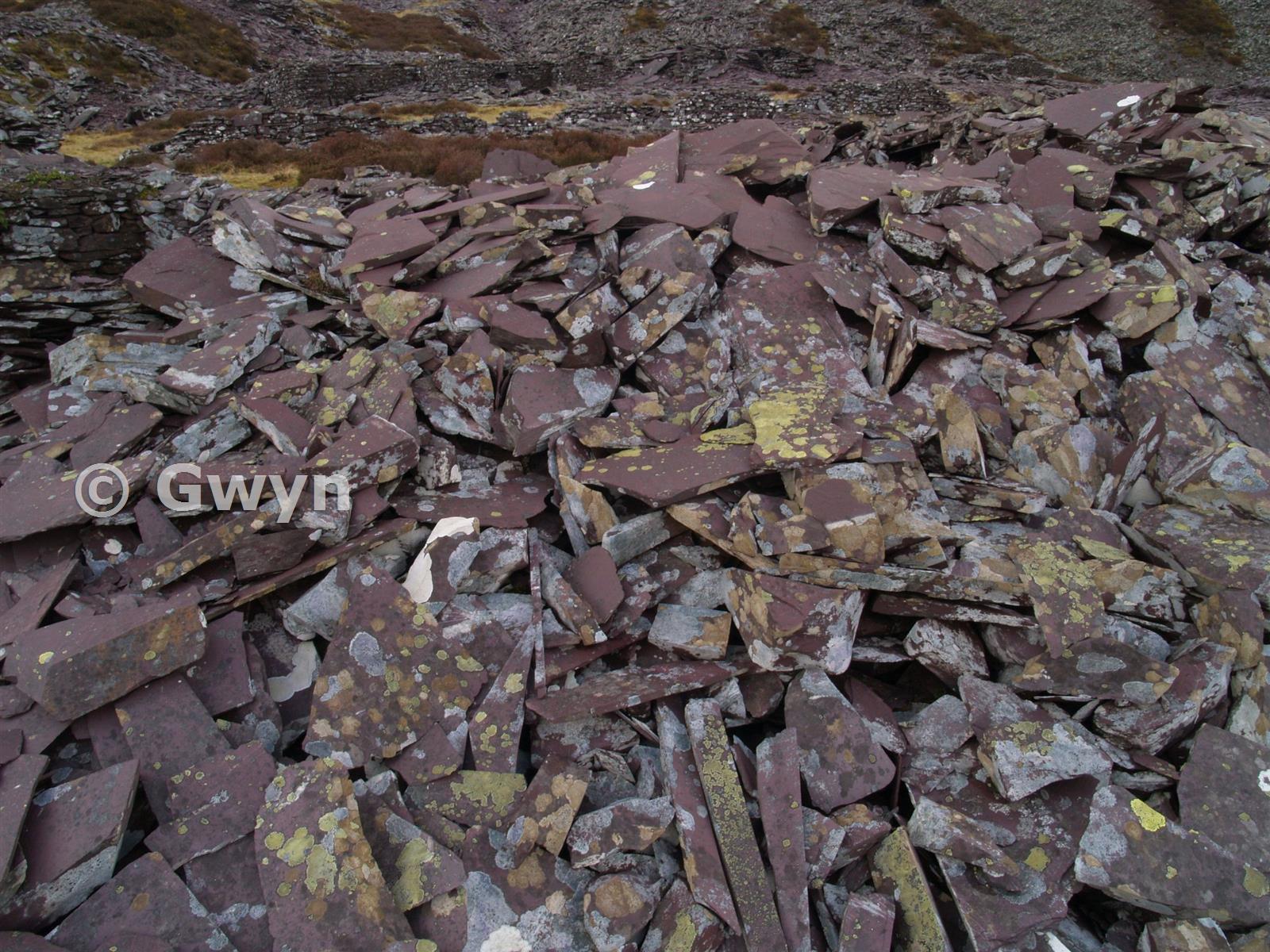 Waste slate on upper mills area. Landscape detail. Lichens.