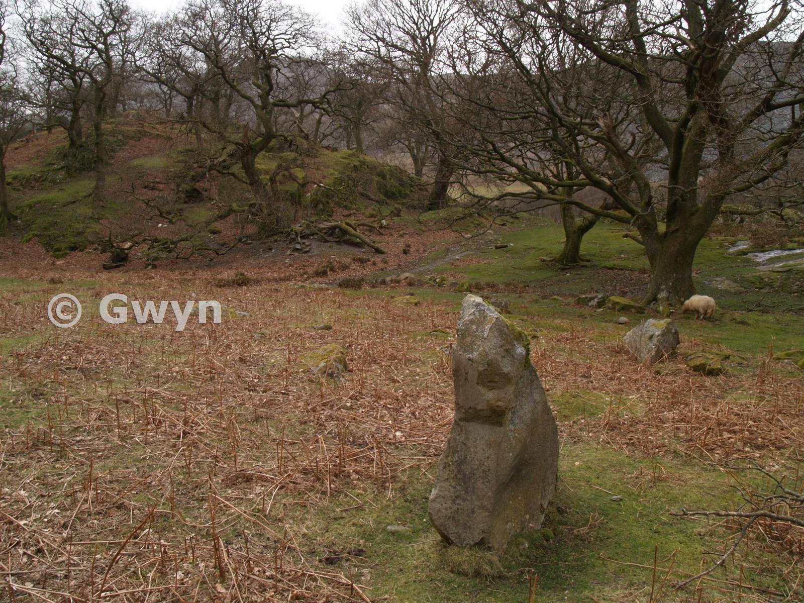 Landscape view of the site. The calciner was left of centre in the picture, under the fallen tree. One flue ran up the hillock, the other ran horizontally at its base. The vertical stone in the foreground is probably a rubbing stone. March, 2009.
