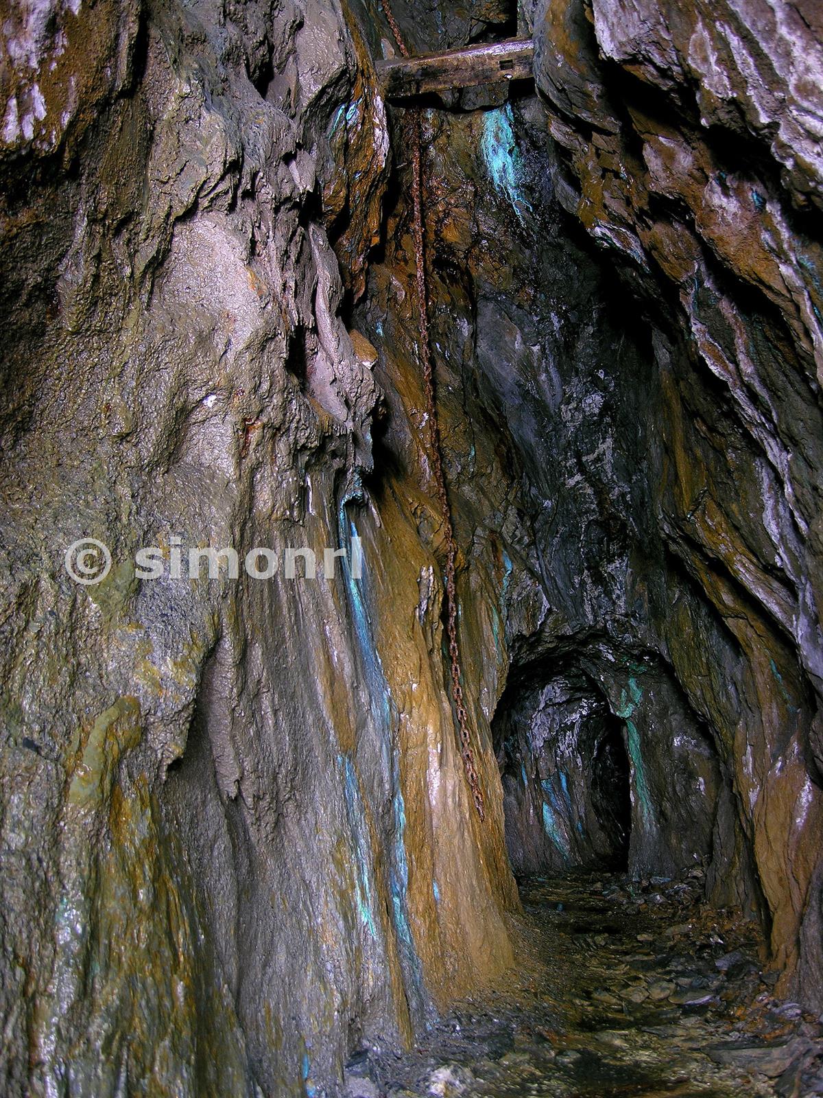 Possibly a working platform, with a chain for access. Drws y Coed copper mine, Nantlle valley, north Wales.