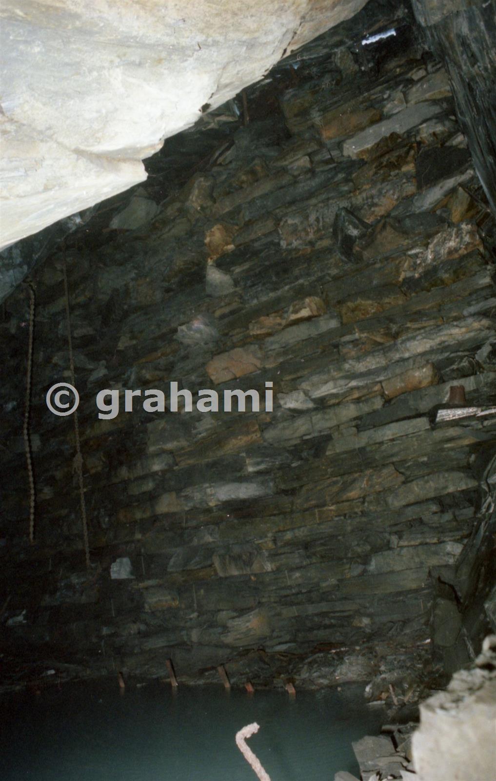 This shows the full height of the retaining wall, it's foot pegged to the solid slate of the chamber forebreast. You can just see a crack of daylight at the top, between roof and wall.