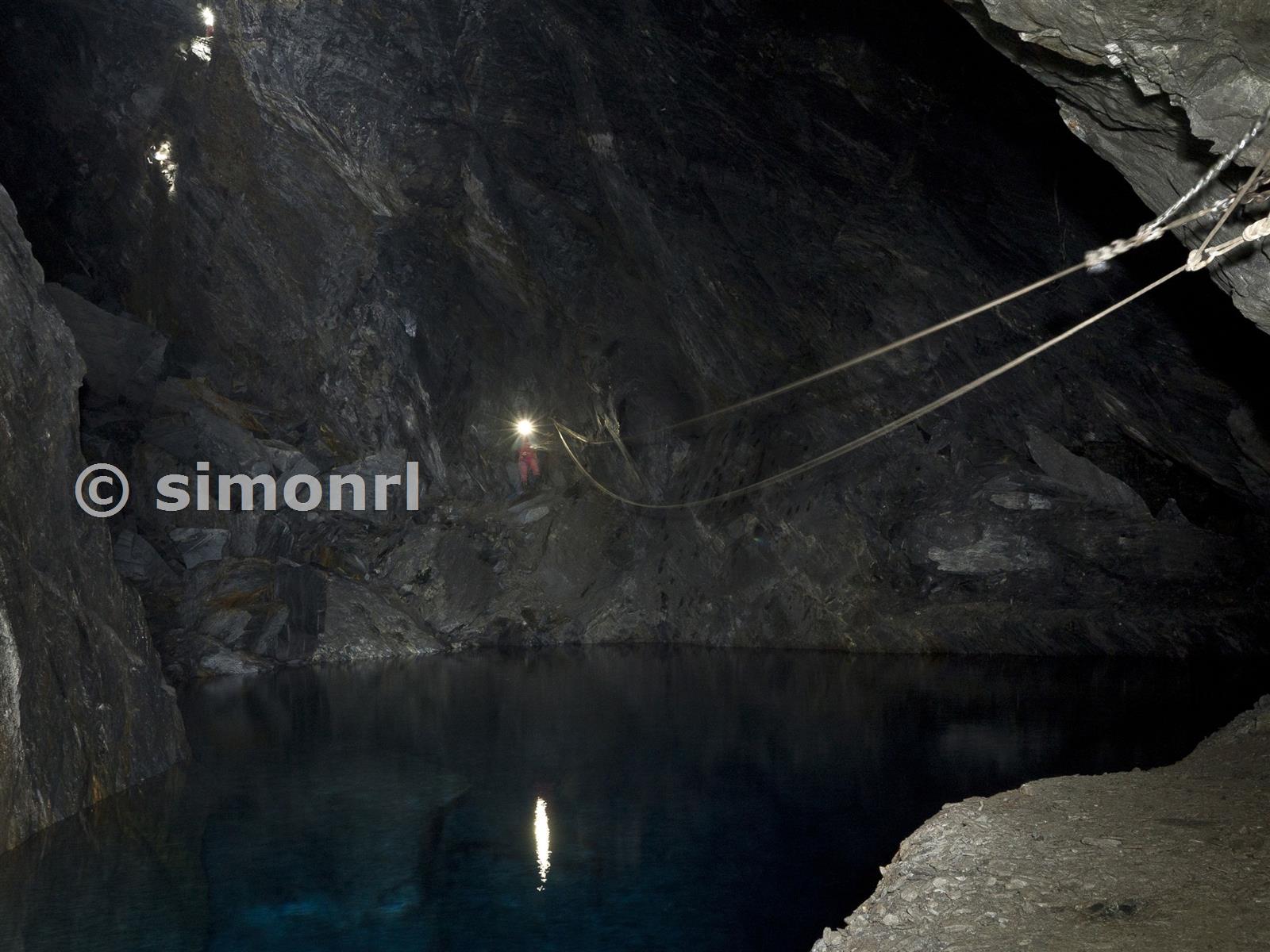 Chamber A3E, one explorer about to take the the air on the zip wire, another mid-way down the second abseil and a third at the top of the second abseil! Croesor Slate Mine May 2012