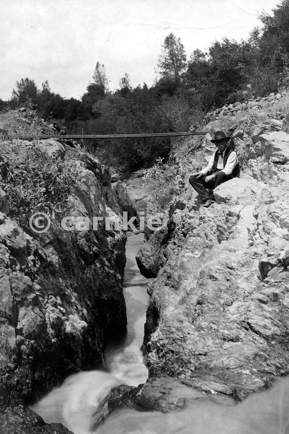 Channel in bedrock, a slate of moderate strength, worn by tailings of Cherokee hydraulic mine in eight years gross time. The net period is estimated at less than two years. Depth of channel 10 feet. Butte County, California. 1905. Courtesy U.S. Geological Survey. The USGS home page is http://www.usgs.gov