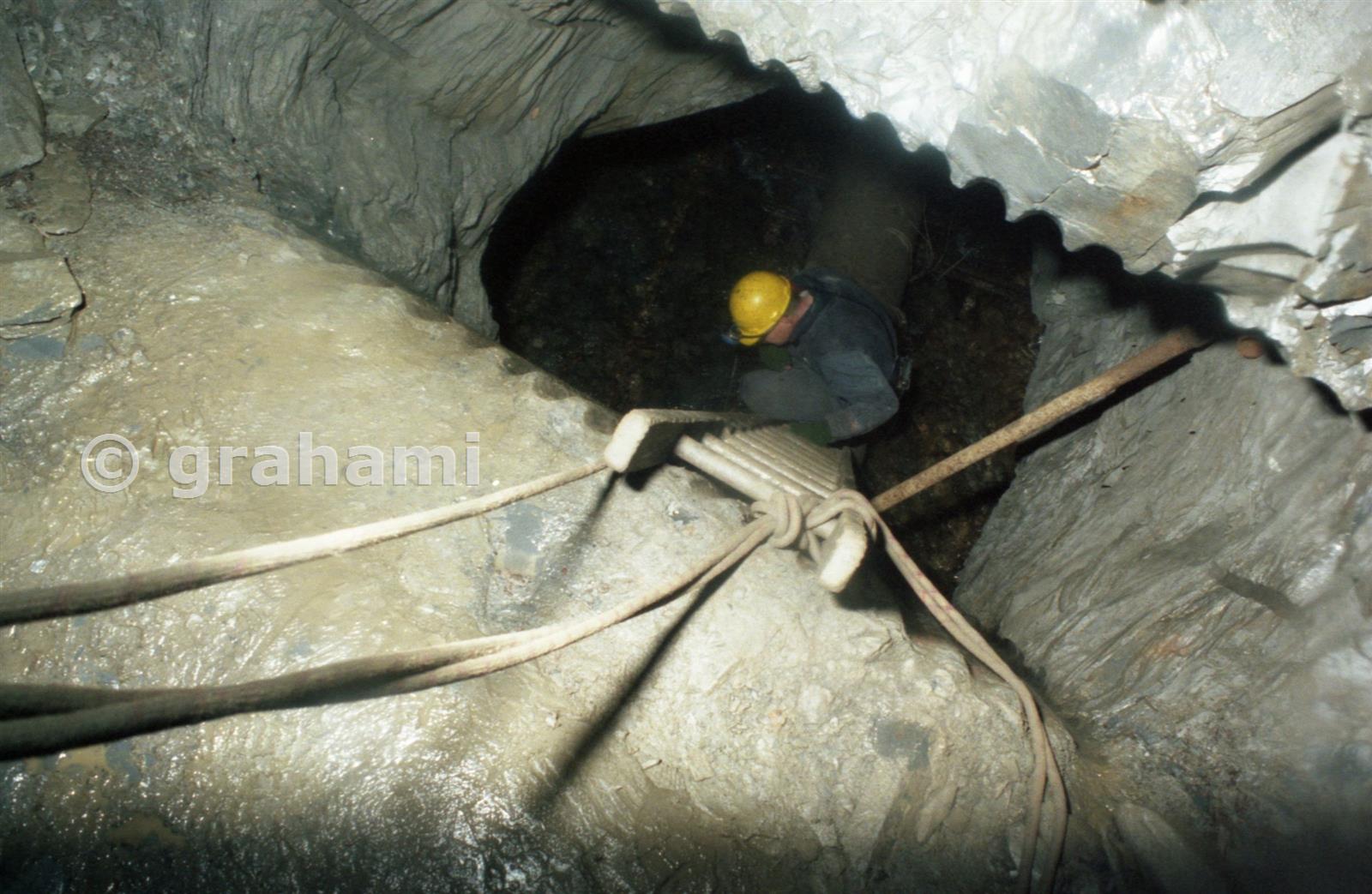 To maintain access to the Drainage Adit, this slot was channelled through the floor of the level from the Pensioners chamber where it crossed above the adit. You can see the relative thinness of the intervening layer!