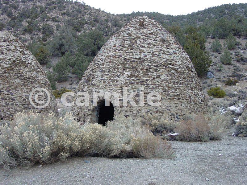 Each beehive-shaped charcoal kiln is approximately 30 feet tall and 30 feet in diameter and made of local stone and mortar. The kilns were built in 1877 to produce charcoal from the surrounding piñon pine and juniper forest in the Panamint Range around Mahogany Flat to provide fuel to the Modoc Mine smelter, 25 miles to the west across the Panamint Valley. Courtesy U.S. Geological Survey. The USGS home page is http://www.usgs.gov