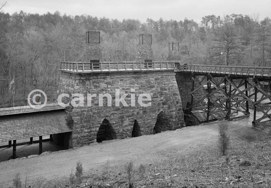 WEST (FRONT) OF FURNACE COMPLEX, INCLUDING STACKS, WITH CHARGING BRIDGE AND TRESSLE. Courtesy Library of Congress, Prints & Photographs Division, HAER reproduction number HAER ALA,63-BUCK,2-12