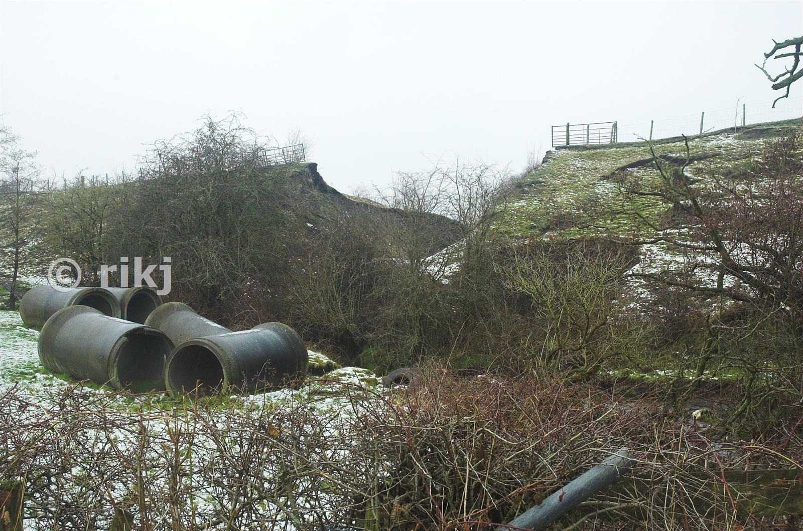 Large embankment for the tramway that served Charles Pit. The pit was the other side of the tramway; the tramway ran both east towards Leeds, and west towards Bradford. The big gap in the middle is where a culvert has been reopened up.