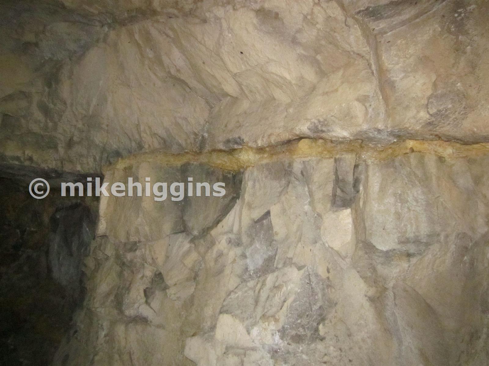 A yellow clay band exposed for some distance along the top of the main passage in the fluorspar section of the mine (the left hand passage)