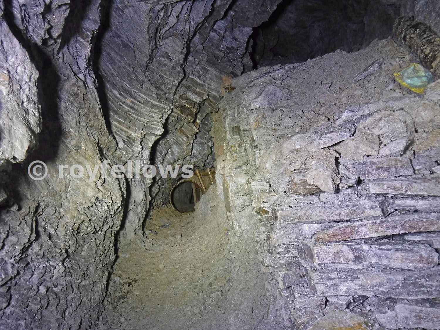 This was originally dug through in the 1970s by Simon Hughes and an oil drum fitted, but this had corroded over time. The level beyond shown in the photograph was a tight crawl under bad roof. This was cleared in 2018 by RF and the bad roof supported by concrete.