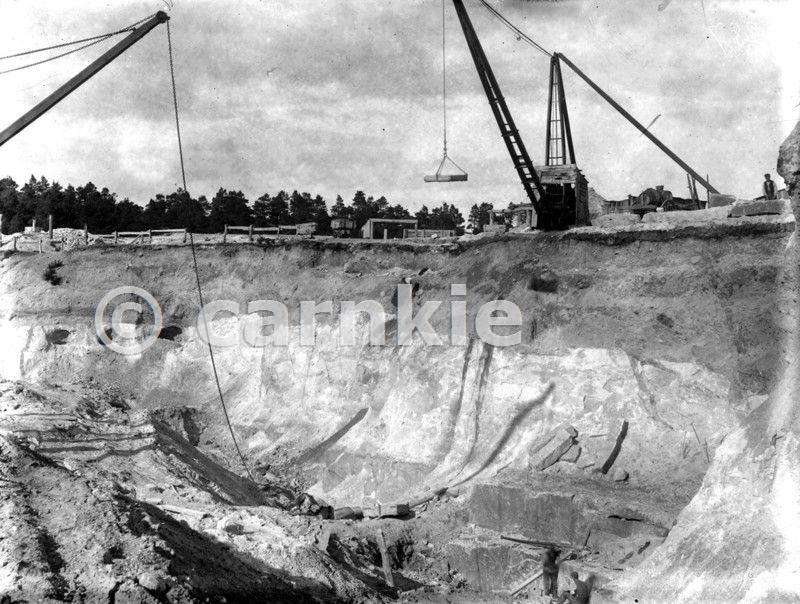 Clynelish Quarry, 1.3 km. west-north-west of Brora. Sutherland. Boulder clay, a glacial deposit resting on sands and fine-grained siliceous white sandstone (Clynestone). A manual winch-operated crane is on the left, a larger powered crane right of centre. The buildings on the extreme right could be the dressing sheds. The sandstones are of the Clynekirkton Sandstone Formation of Corallian (Upper Jurassic) age. Photo P000007. Reproduced with the permission of the British Geological Survey ©NERC. All rights Reserved.