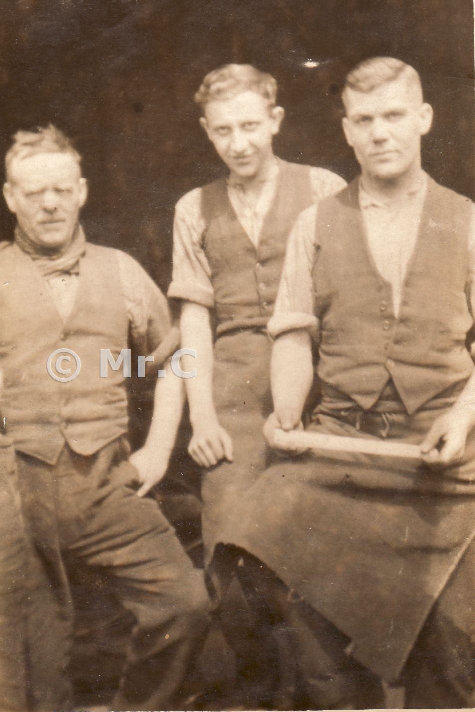 Colliery blacksmiths around 1920. Left to right ; Foreman Blacksmith Samuel Oakes (my Great Grandfather), George Martin & Steve Matthews. Colliery Blacksmiths had nothing to do with shoeing horses - thats farriers! They made and maintained everything they could, used both above & below ground. Possibly unique to the N. Staffs coalfield, they were also responsible for the shafts.