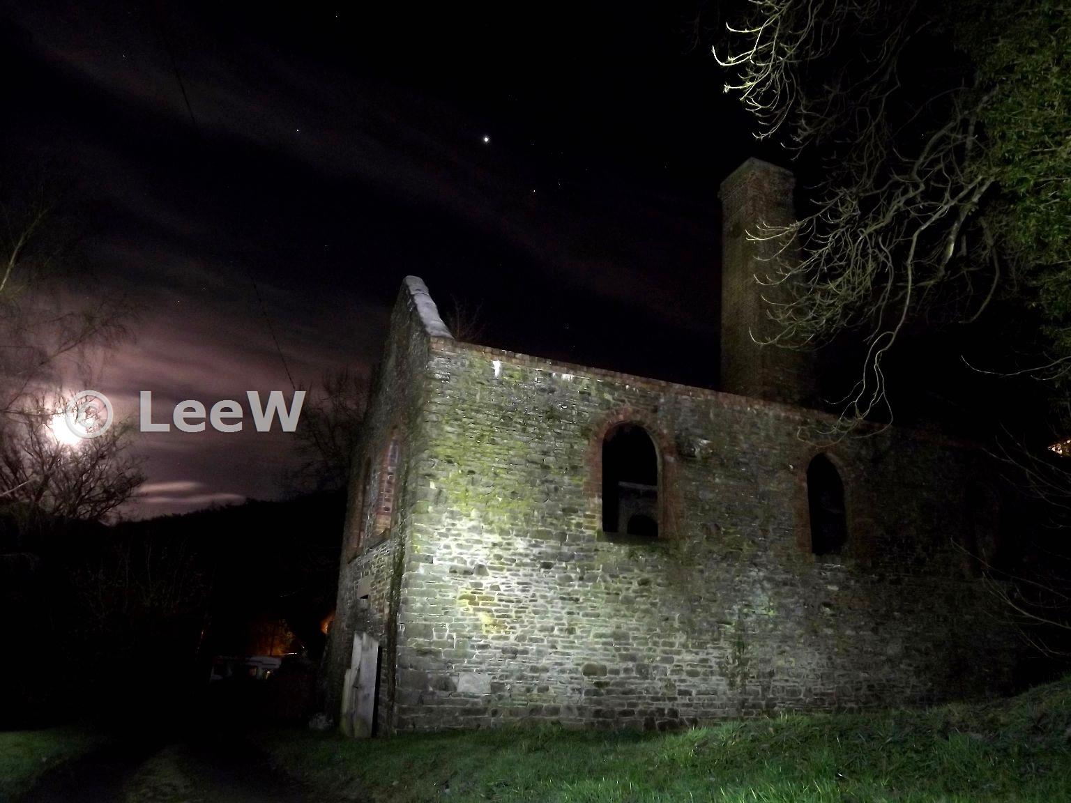 View of the compressor house at night with some stars above and the moon giving a nice effect through the clouds