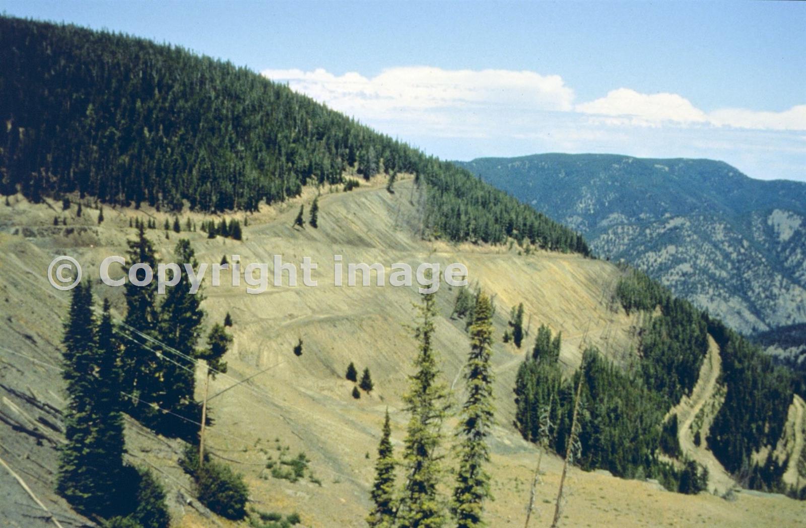 Part of the Blackbird Mine site, the Bucktail drainage basin. This image shows contaminated waste rock and tailings.