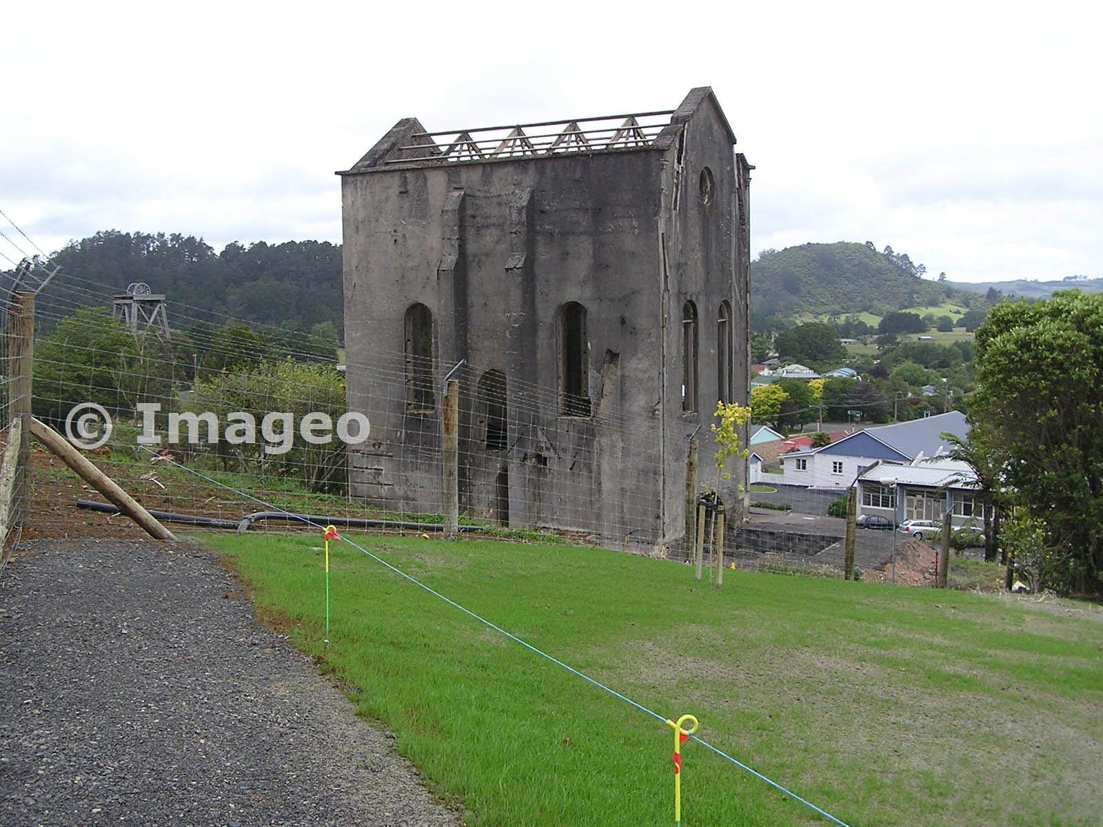 A view from the pit side showing the pumphouse in its relocated position just above the town of Waihi. Final landscaping still in progress.