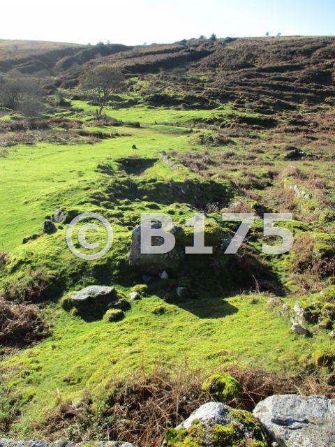 Looking down onto a miner''s cottage, Mine Captain''s House and Miner''s bunkhouse in the foreground towards the miners dry and carpenter''s shop over the other side of the Redwater Valley. On the hillside beyond is a deep incision openwork