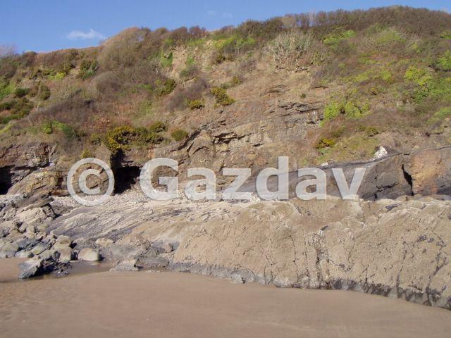 To the right n the ledge of rock is the remains of the blacksmithe workshop which is slowly being eroded by the sea. In the centre of the photo is a fall of rock. Behind the fall is the entrance to the Crickdam tunnel. The black patches to the left are where Iron ore has beed extracted from the cliff face. Crickdam Cottage was on the cliff to right, that now has slid down onto the beach.